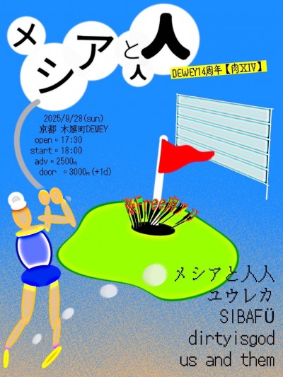 メシアと人人×DEWEY14周年【肉ⅩⅣ】 メシアと人人/ユウレカ/SIBAFÜ/dirtyisgod/us and them open17:30 start18:00 前売¥2,500/当日¥3,000(+1DRINK¥500) ※FREE肉あり 御予約は 各演者か info@kiyamachi-dewy.comまで |