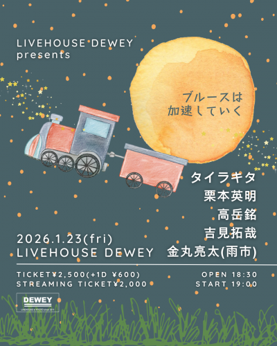 2026年 "年男で福男" 午年パラダイス! イシダストン(ブギーパンツ/よしこストンfam)/住石アラン(the blue sundays)/中見慶輝(.five)/中村響太郎(モラトリアム)/工藤玄暉/関谷 真(ヨアケノユメ) open17:30 start18:00 ¥2,500(+1DRINK¥600)/配信¥2,000 配信チケット購入・視聴 & 演者にドリンク奢れる権はコチラから https://premier.twitcasting.tv/livehouse_dewey/shopcart/407465 |