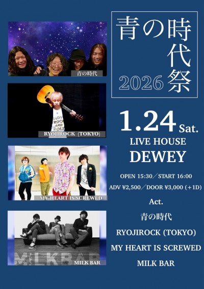 青の時代企画【青の時代祭】 青の時代/RYOJIROCK (東京)/MY HEART IS SCREWED/MILK BAR open15:30 start16:00 前売¥2,500/当日¥3,000(+1drink¥500) 御予約は各演者か DEWEYまで(info@kiyamachi-dewey.com) |
